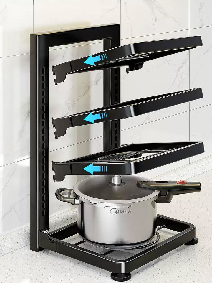 HÖHENVERSTELLBARE EBENEN: Das innovative Stufendesign ermöglicht die individuelle Anpassung des Abstands zwischen den Ebenen. So finden hohe Töpfe, flache Pfannen und alles dazwischen problemlos Platz – für maximale Flexibilität. FÜR ALLES GEEIGNET: Organisieren Sie mühelos nicht nur Topfdeckel, sondern auch Schneidebretter, Backbleche, Servierplatten und Teller. Die perfekte All-in-One-Lösung für Ihre Küchenarbeitsplatte.